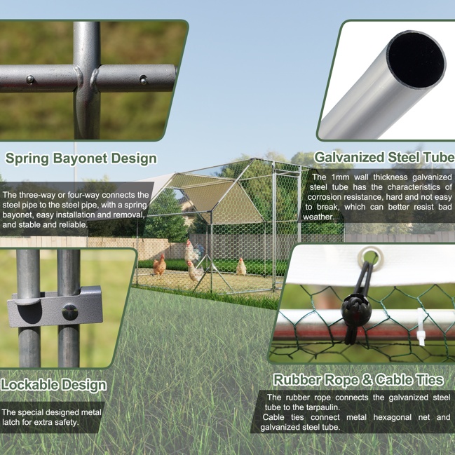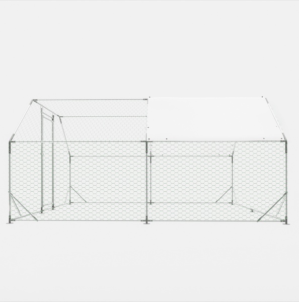 This heavy-duty chicken coop provides a large, comfortable, and safe space for your pets, whether they are chickens, ducks, rabbits or cats, dogs, or bamboo rats. Built with robust steel tubes, an extra thick tarp, and durable wire mesh, this chicken run is an ideal setting for raising animals all year round. The galvanized steel pipe used to construct the chicken cage greatly improves the rust resistance of the cage, giving it a longer life than other products. The walls of the chicken cage are made of PVC-coated hexagonal metal mesh, which is strong and durable, and not easily damaged. The chicken coop tarp is removable, so you can have the option of letting the animals enjoy the warmth of the sun as well as avoiding rain, snow, and excessive UV rays. Don’t hesitate, this sturdy and durable chicken cage will become your animals’ new favorite place!