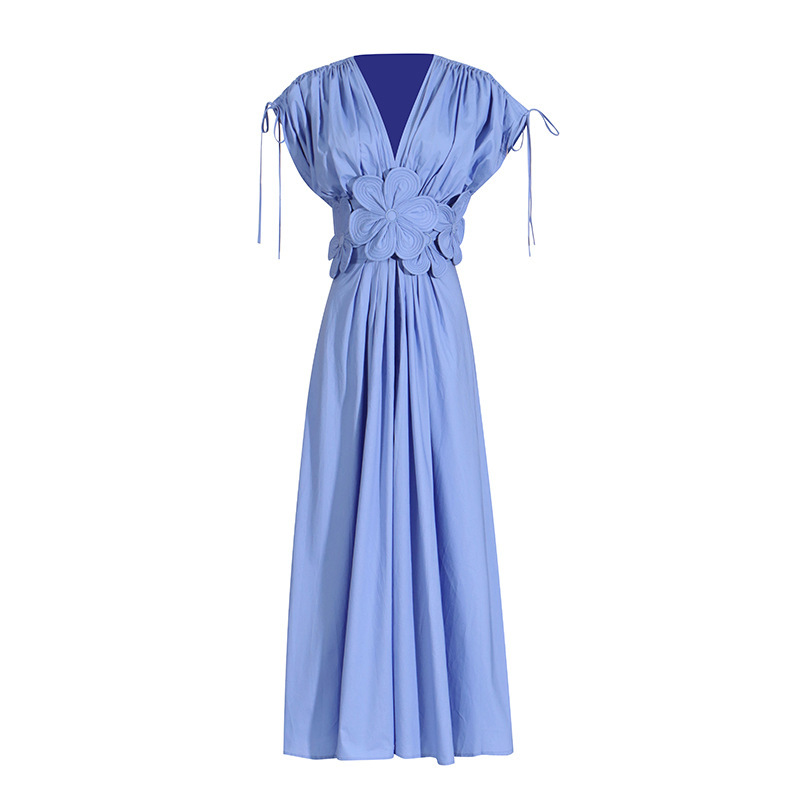 V-neck Lace-up Pleating Design Flower Stitching High Waist Dress