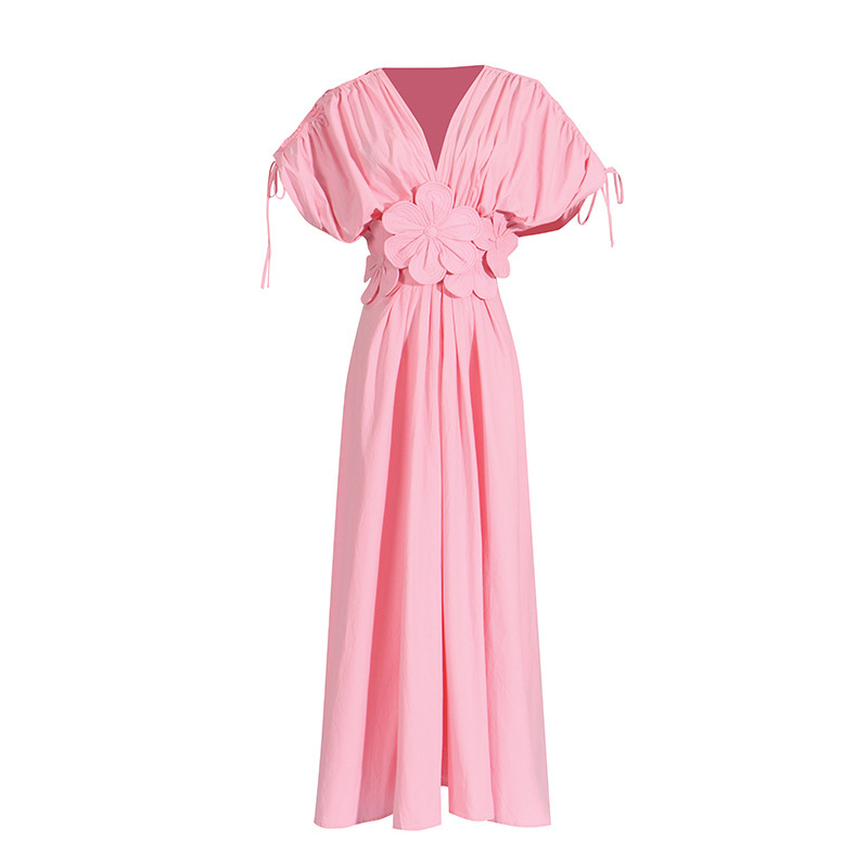 7 reviews for V-neck Lace-up Pleating Design Flower Stitching High Waist Dress