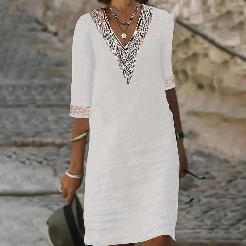 Elevate your wardrobe with this Chic Guipure Lace V-Neck Tunic Dress, a perfect blend of elegance and comfort. Crafted from delicate guipure lace featuring intricate hollow details, this knee-length dress offers a sophisticated yet breathable design ideal for all-season wear.