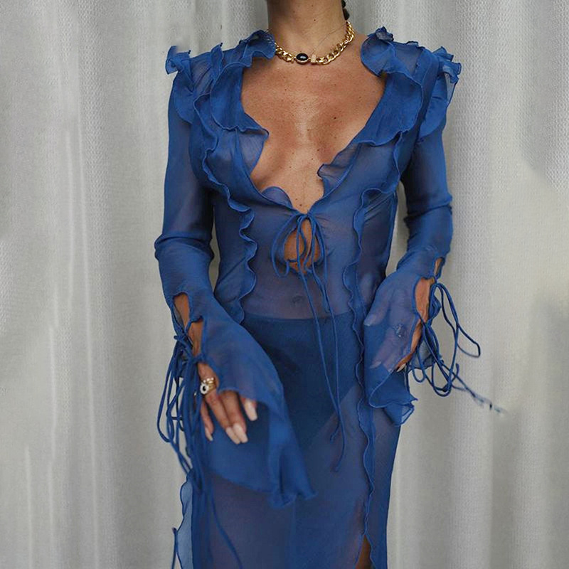 Women’s Perspective Anti-car Edge Drawstring V-neck Slit Dress